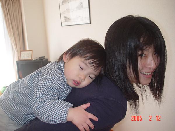 お母ちゃんの背中にペターンとして寝ちゃっ …